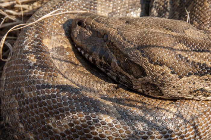 The southern subspecies (Python sebae natalensis) shares many similarities with the African rock python’s appearance. However, the Southern African rock python can be distinguished by the smaller scales on top of the head, the smaller (or totally absent) subocular mark, as well as by its smaller size in general, since adults average about 2.4 – 4.4 meters.